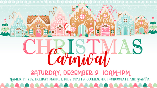 Join us for a festive Christmas Carnival. We will have carnival games, prizes, a holiday market, hot chocolate and a visit from Santa! This is a free event open to the public.