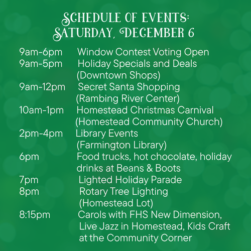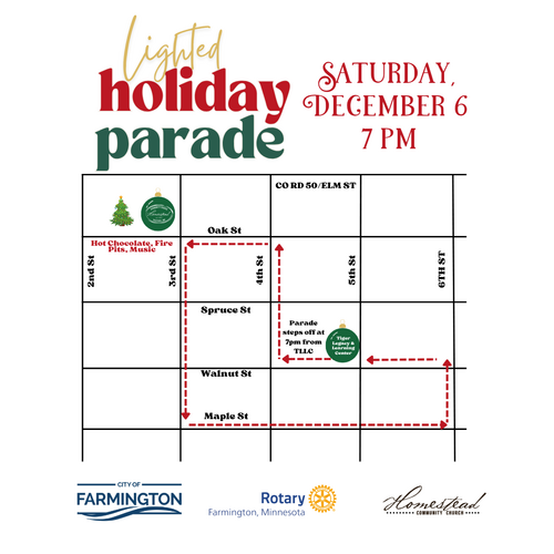 Join us on December 6 for the second annual Holiday Lighted Parade in Farmington! This new holiday tradition is a fun filled family event to celebrate the holiday season with our entire community. Come downtown starting at 6pm to get free hot chocolate, enjoy the fire pits, grab a treat from Hoppers Mini Donut food truck, and purchase fun holiday drinks from Beans and Boots! Once you find your favorite spot along the parade route, sit back and enjoy the holiday parade with over 40 lighted floats! After the parade, join us for the Rotary Holiday Tree lighting on the Homestead Lot and then stick around for holiday carols from the FHS New Dimensions group, stop inside Homestead to hear some holiday jazz, or drop into the Community Corner for a fun kids craft!