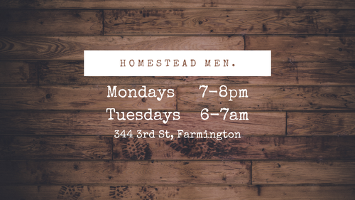 Homestead Church challenges Men to lead and grow in their faith, creating disciples. Our Men's Group meets Monday evenings from 7-8pm or Tuesday mornings from 6-7am at the Farmington Campus. Prior to the meeting, you will be reading the designated chapter each day, reflecting on how God is speaking to you through those passages (please refer to the Bible Reading Plan Graphic). When we meet, we will be discussing the previous week's bible chapter.