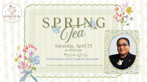 Join us for Homestead Women's Spring Tea on Saturday, April 25 at 10am! We will enjoy a lovely brunch with other women and an encouraging message by Charlene Williams! Tickets are limited and available for purchase .